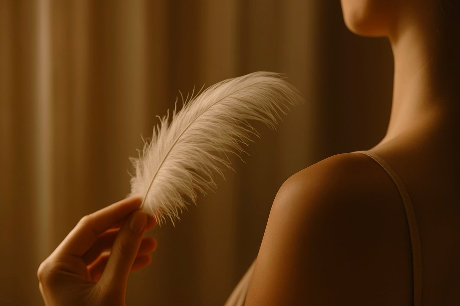 Nabízím pomalé, vědomé doteky – hlazení, škrábání, šimrání a práci s péřovými pomůckami, které zklidňují nervový systém a přinášejí hluboký pocit uvolnění.